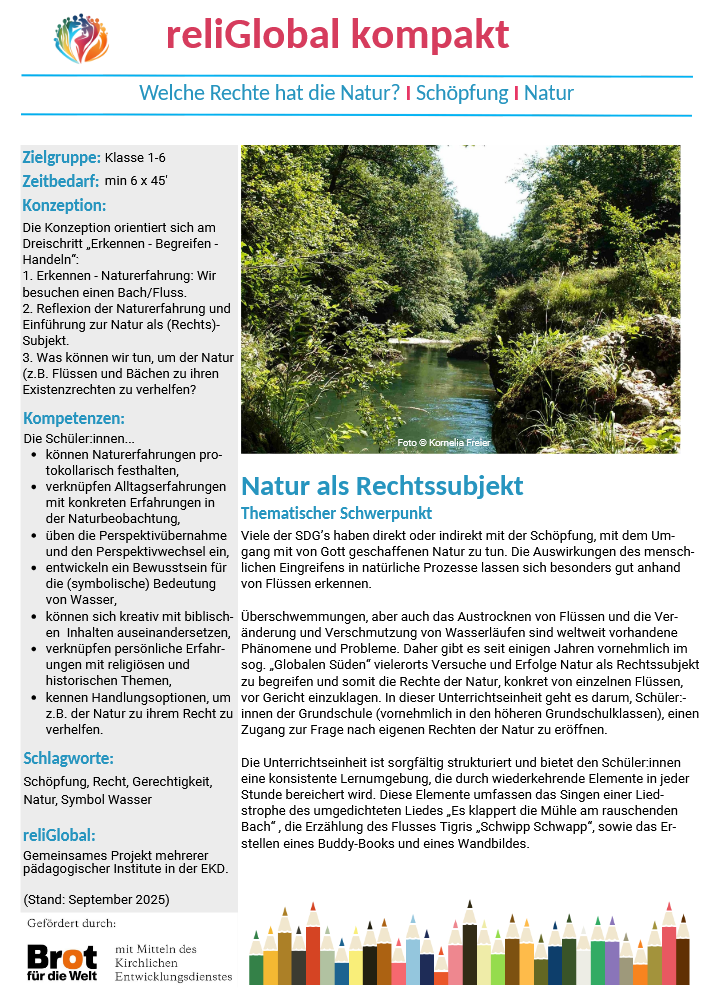 Daher gibt es seit einigen Jahren vornehmlich im sog. „Globalen Süden“ vielerorts Versuche und Erfolge, Natur als Rechtssubjekt zu begreifen und somit die Rechte der Natur, konkret von einzelnen Flüssen, vor Gericht einzuklagen. In dieser Unterrichtseinheit geht es darum, Schüler*innen der Grundschule (vornehmlich in den höheren Grundschulklassen) und der Sekundarstufe I (Klassen 5 und 6) einen Zugang zur Frage nach eigenen Rechten der Natur zu eröffnen.