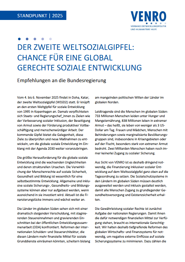 Der kommende Gipfel bietet die Gelegenheit, diese Ziele zu überprüfen und neue Maßnahmen zu entwickeln, um die globale soziale Entwicklung im Einklang mit der Agenda 2030 weiter voranzubringen. In dem Standpunkt zeigt VENRO die notwendigen Schritte auf, um die Finanzierung sozialer Sicherheit in den Ländern im globalen Süden zu verbessern.